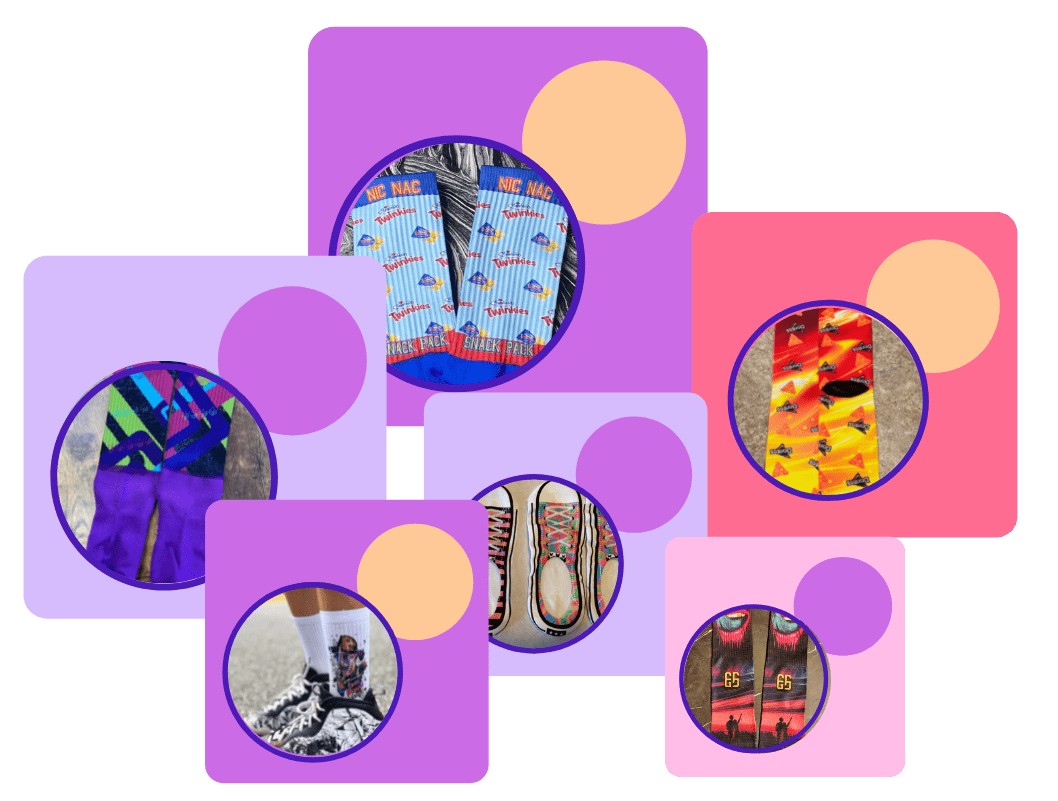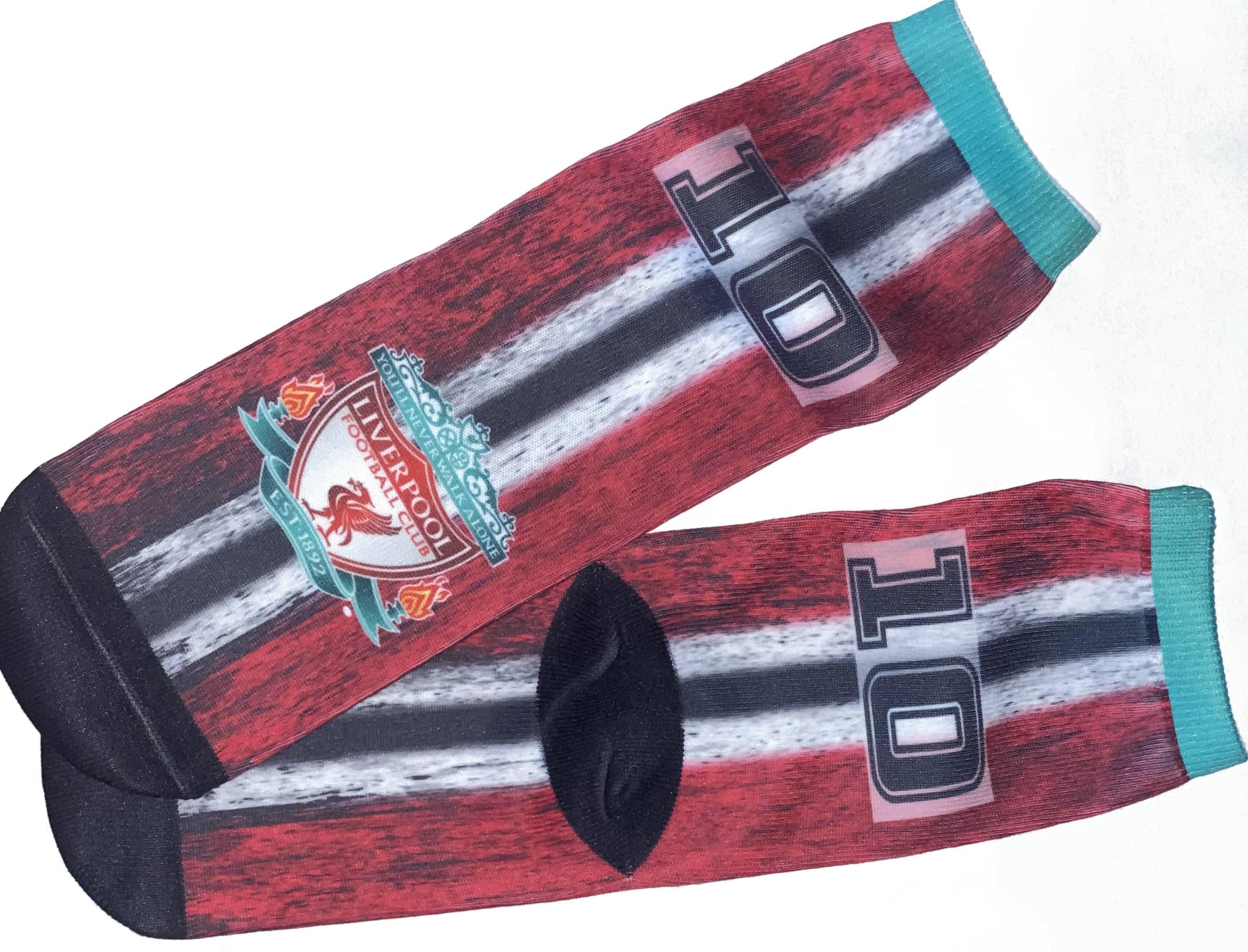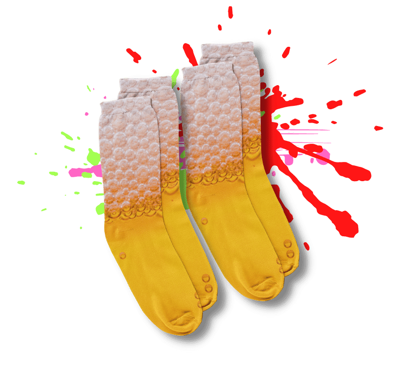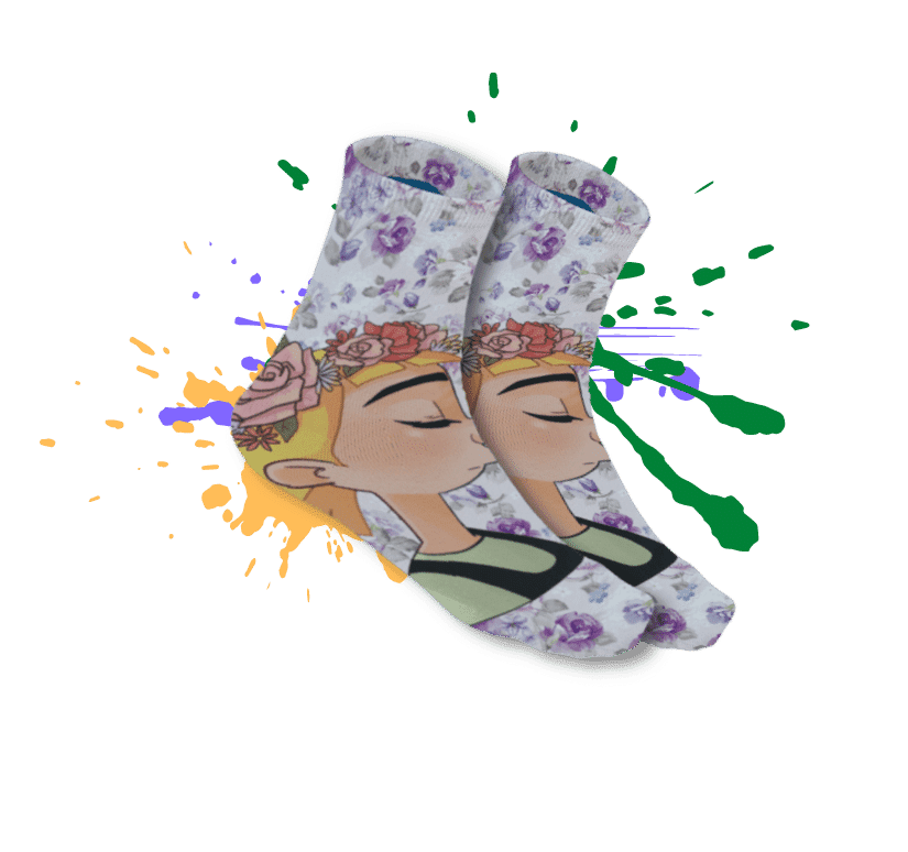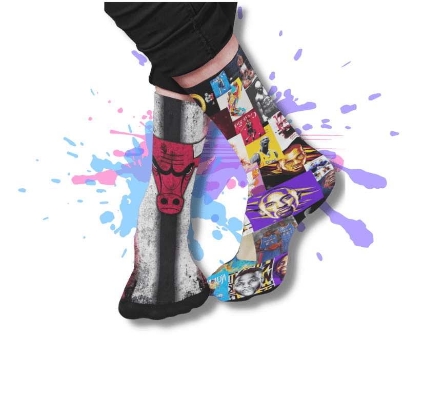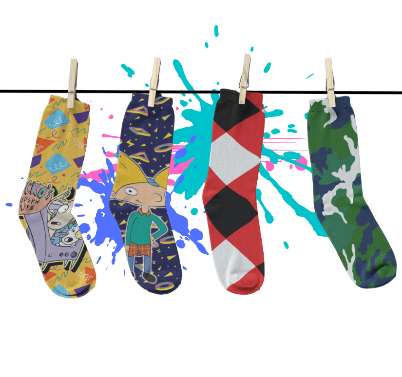 Úr hverju eru sokkarnir gerðir? 70% polýester í ytra efni svo við getum náð fram hágæða þrykkingu. 25% Bómull er innra lag svo þú færð mjúka og þæginlega tilfinningu við sokkana. Svo notum við 5% spandex til að tryggja teygjanleika og stuðning. Sokkarnir koma svo með svörtum hæl og á tá svæði.